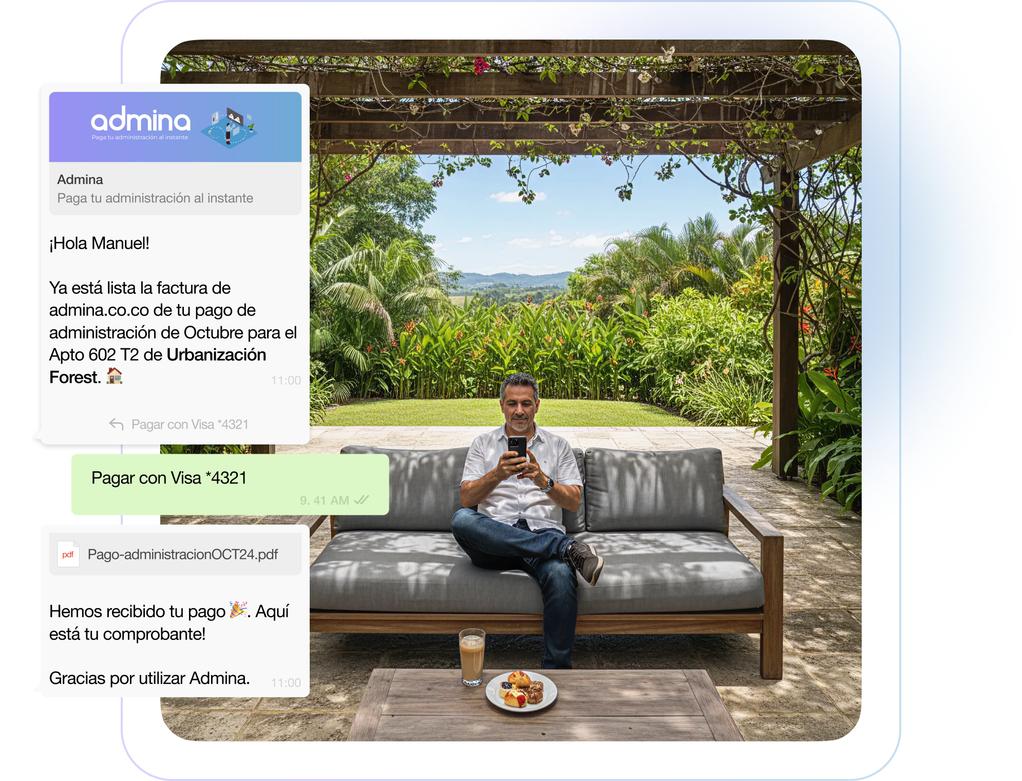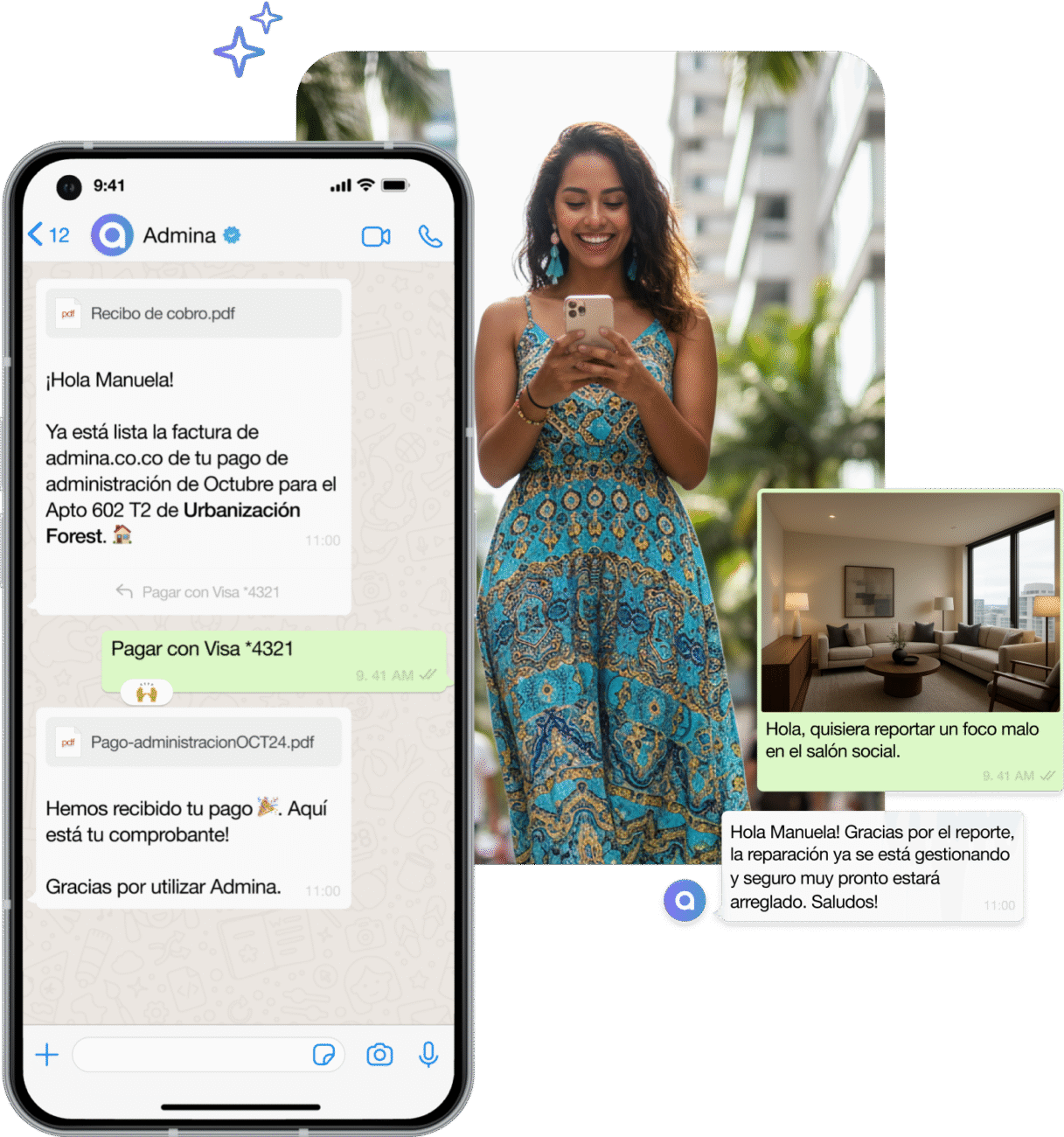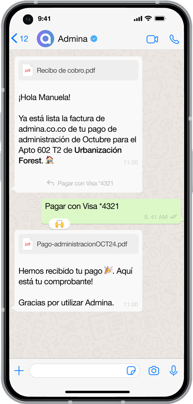 Admina se comunica con los residentes de tu conjunto por un solo chat de WhatsApp, envía cobros, comprobantes y responde PQRs, todo automatizado con inteligencia artificial.