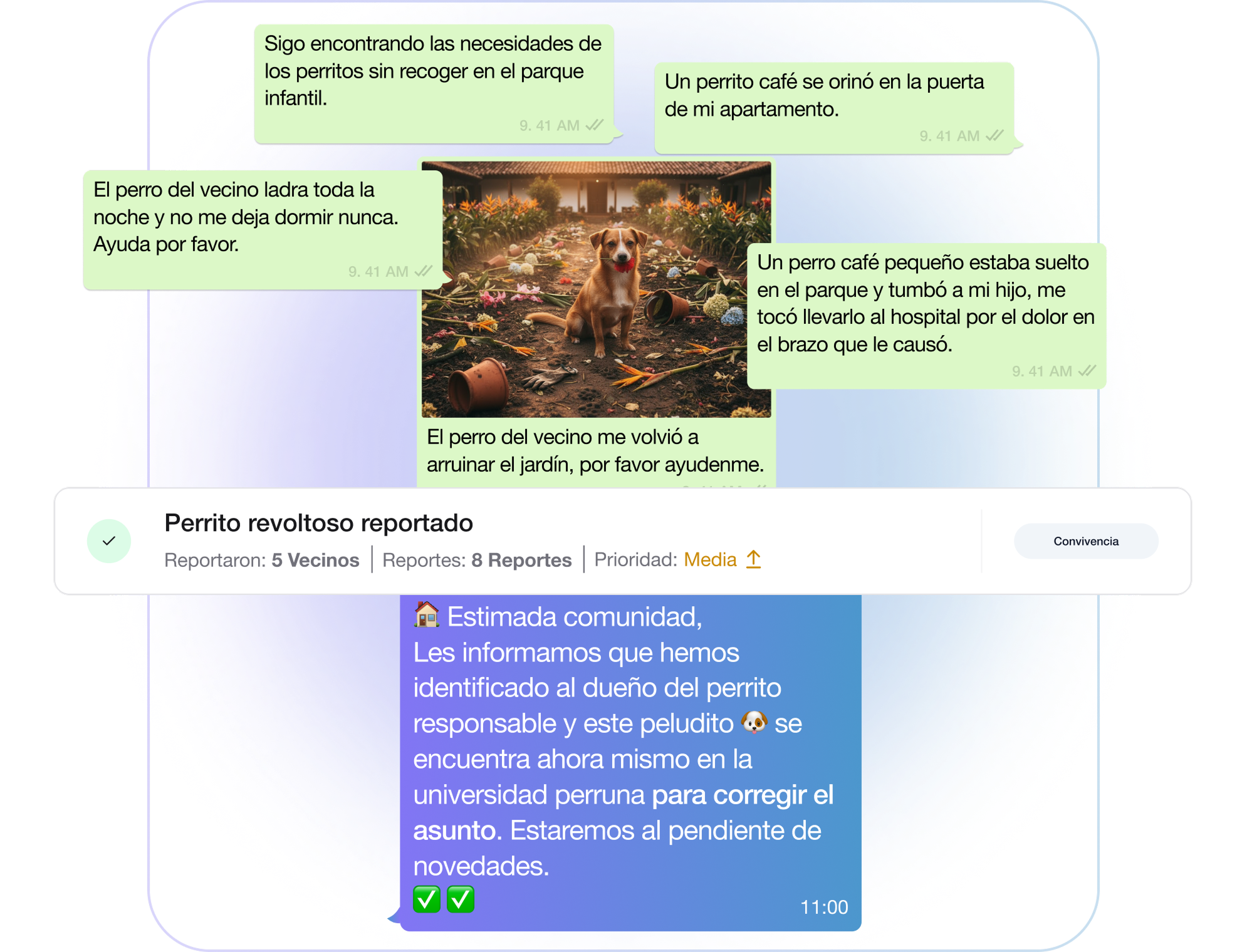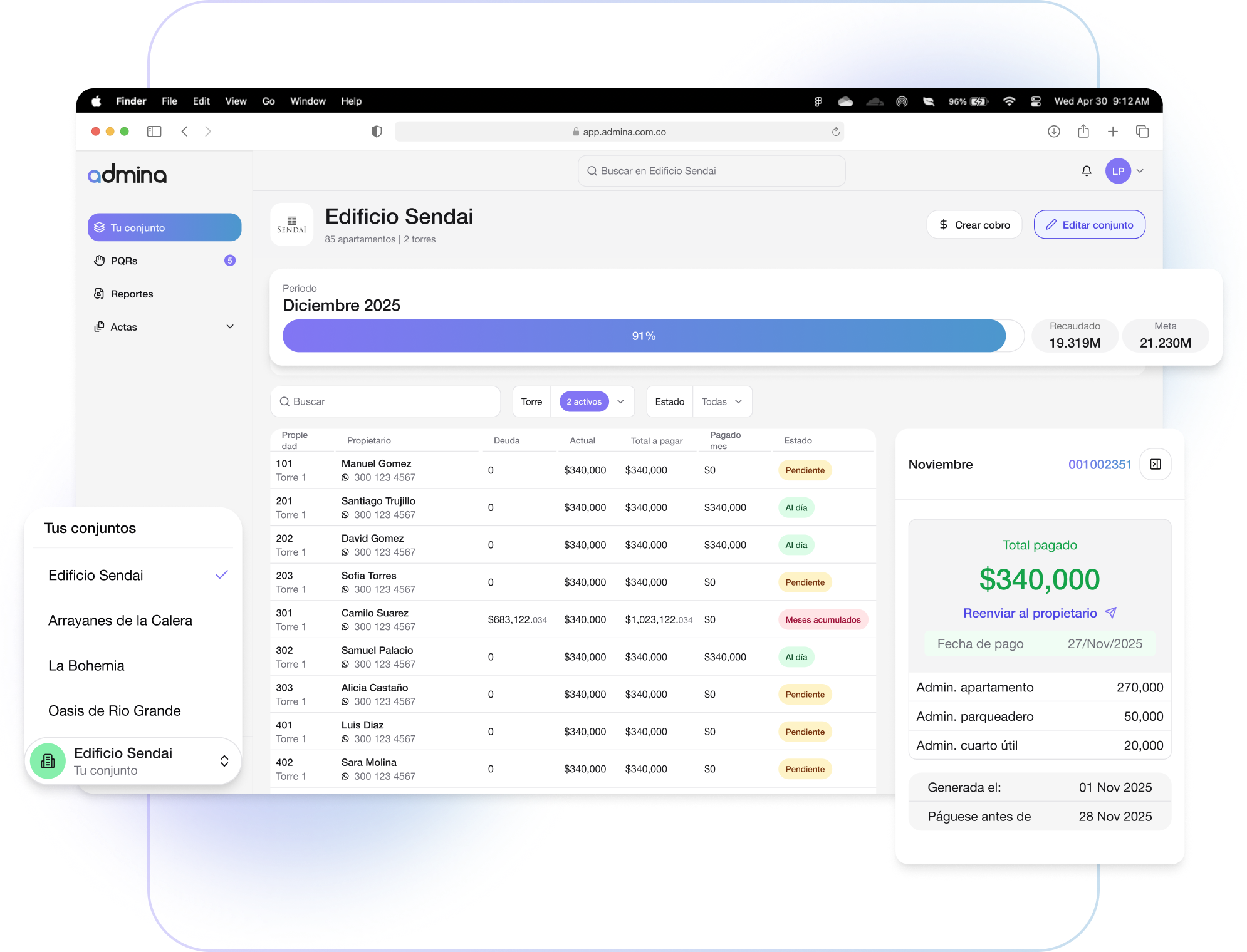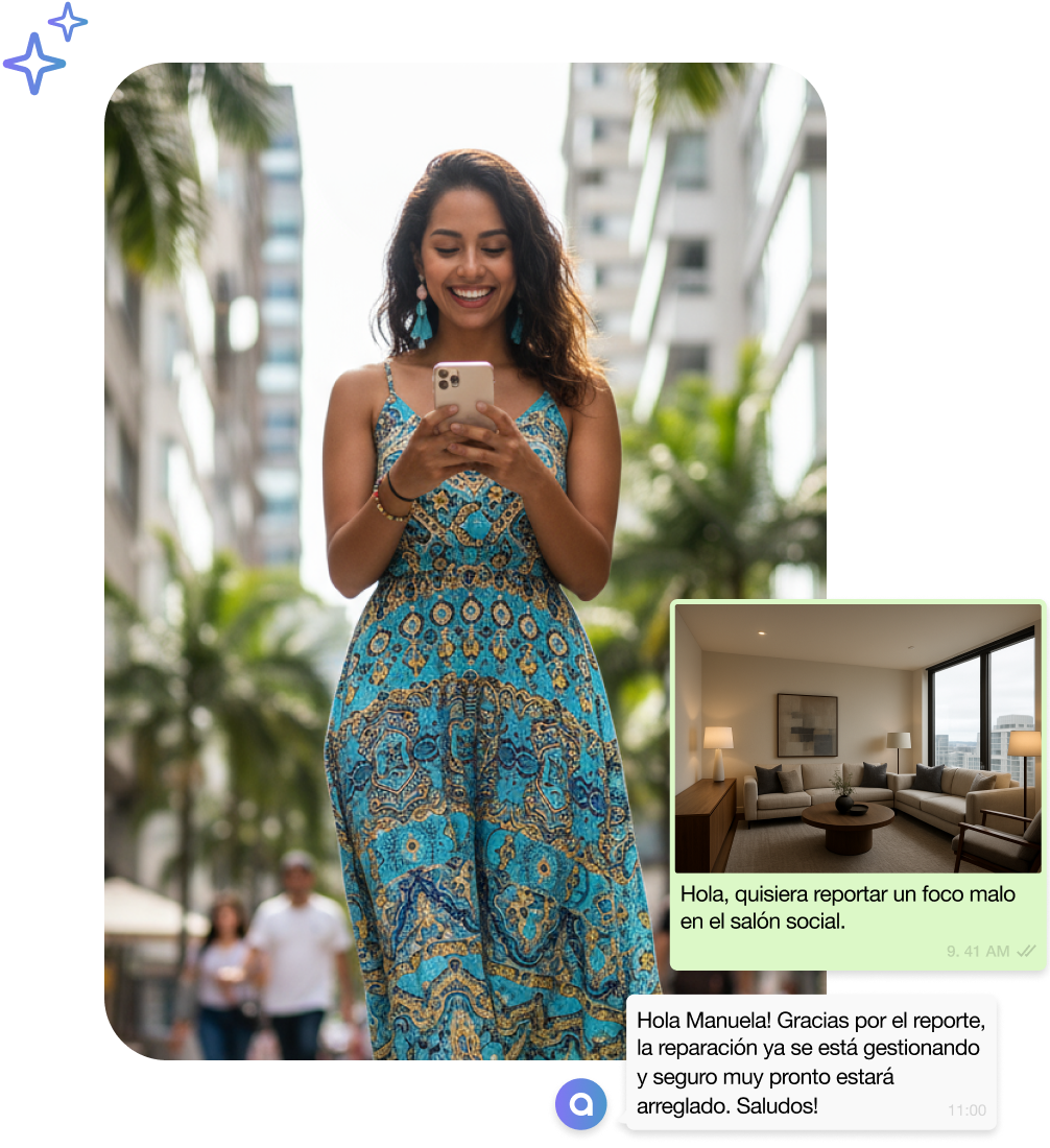 Admina se comunica con los residentes de tu conjunto por un solo chat de WhatsApp, envía cobros, comprobantes y responde PQRs, todo automatizado con inteligencia artificial.